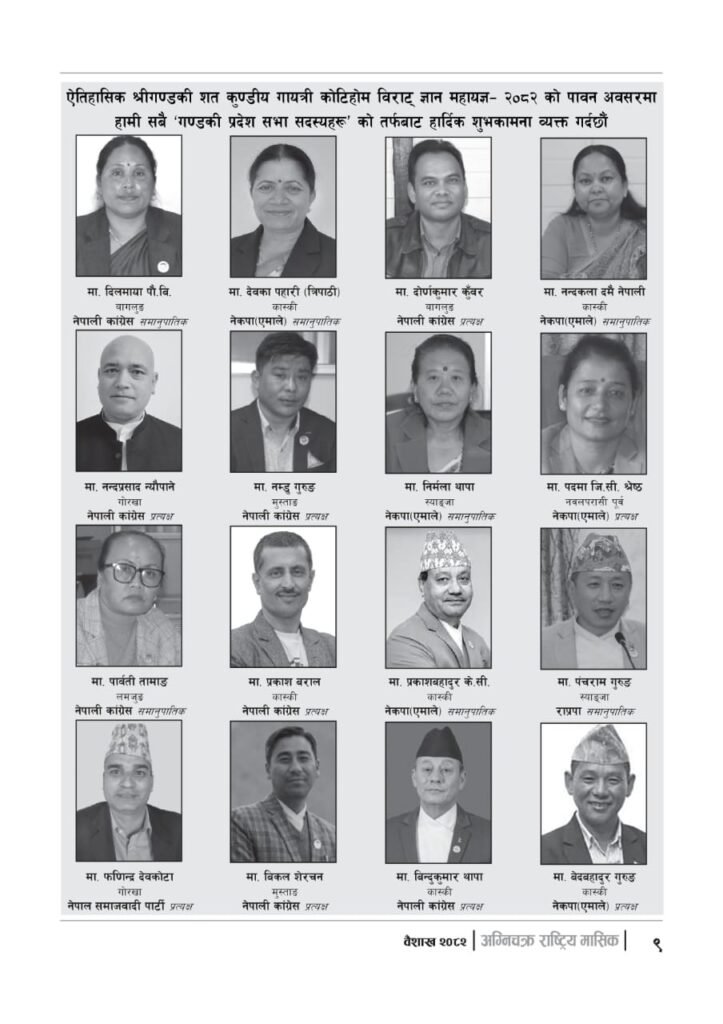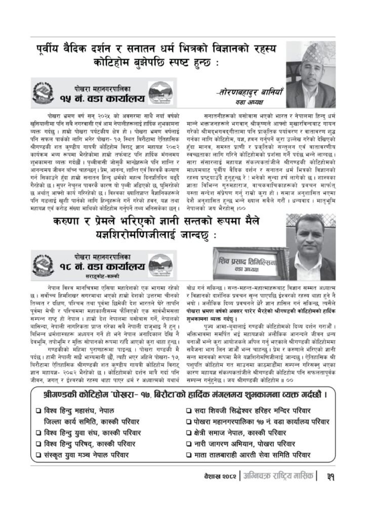 पोखरा महानगरपालिकाका प्राय: सबै वडा अध्यक्षज्यूहरु, समाजसेवीहरु, उद्योगी-व्यवसायीहरु, धार्मिक संघ-संस्था लगायत गण्डकी प्रदेश सभाका सम्पूर्ण माननीय सदस्यज्यूहरुले समेत गण्डकी कोटिहोमलाई शुभकामना दिनुभएको प्रमाण अग्निचक्रमा छापिएको छ | कास्की बाट निर्वाचित प्रतिनिधि सभाका केन्द्रिय सांसदहरुको पनि अन्तर्वार्ता र शुभकामना समेत अग्निचक्रमा पढ्न पाइन्छ |